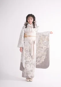 この白×グレーの振袖は、清楚で上品なのにちゃんと華やか。花のデザインがふんだんに入っていて、大人っぽさと可愛さのバランスが最高です。